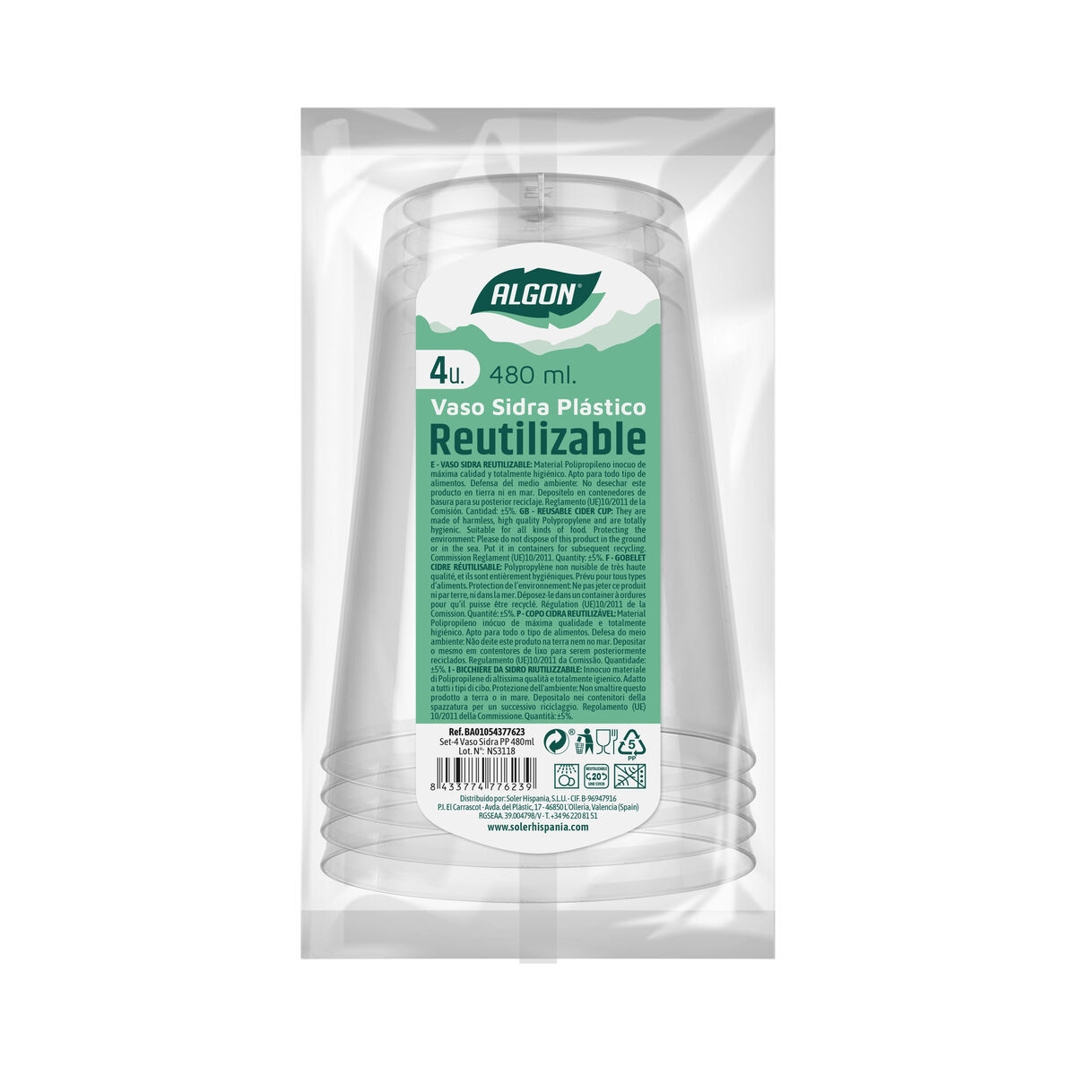 Set de vasos reutilizables Algon Sidra Transparente 4 Piezas 480 ml (50 Unidades)